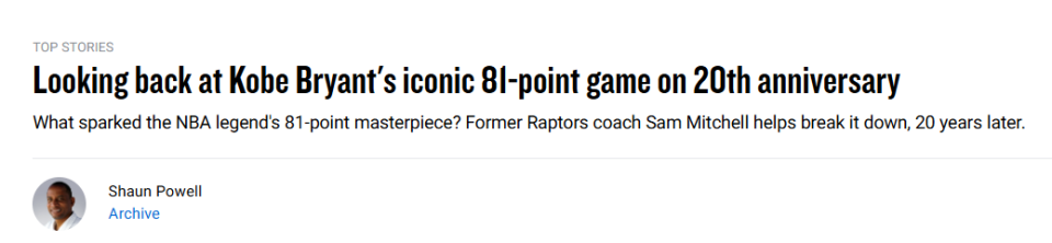 北京时间1月23日,20年前的今天,科比-布莱恩特在对阵猛龙的比赛中轰下81分。NBA官网撰写长文致敬这一神迹,并采访了当时科比这场比赛的对手主帅萨姆-米切尔。他从对手的角度回顾了这一场经典之战,以下是官网全文——